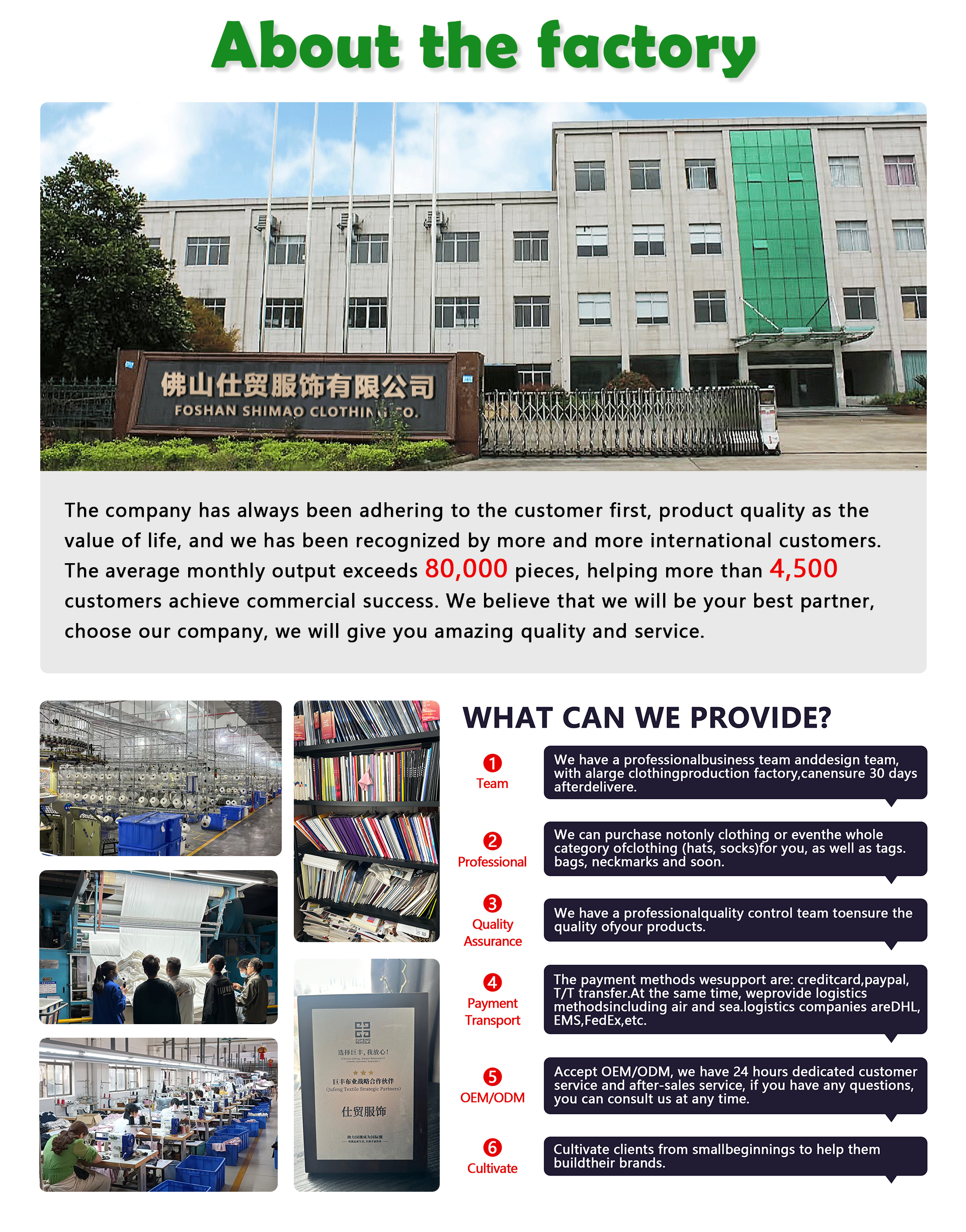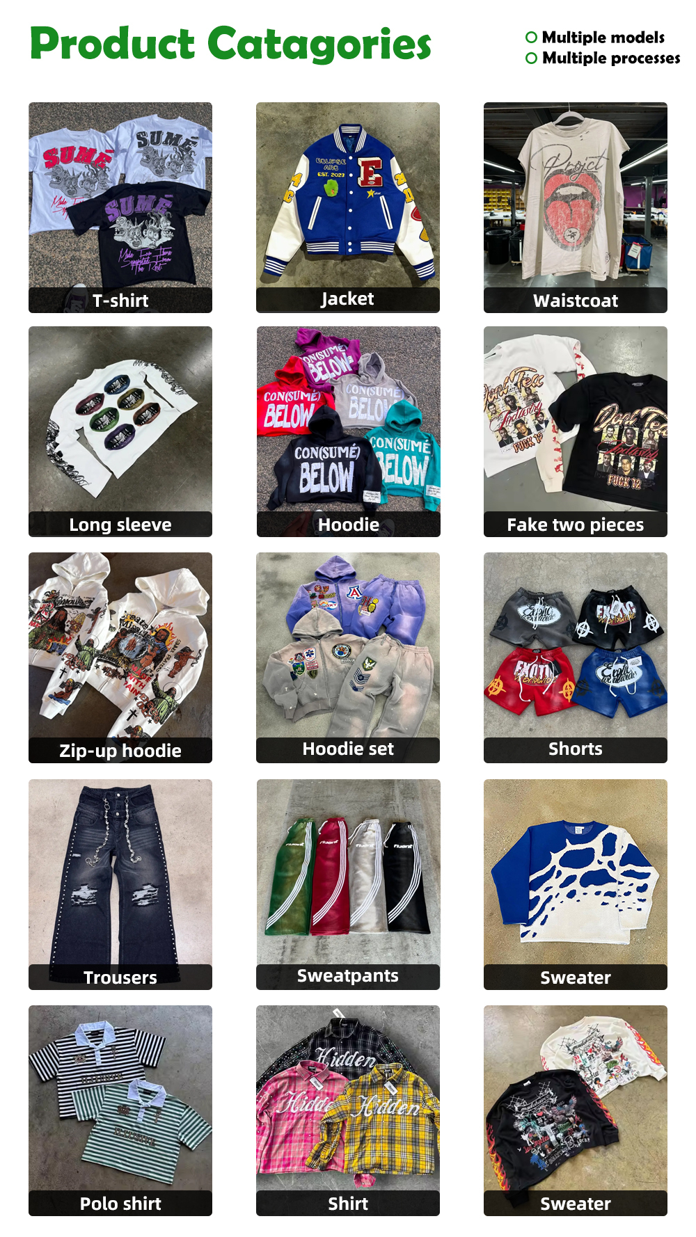 Productos principales:Camiseta, Sudadera con capucha, pantalones, pantalones de chándal, chaqueta